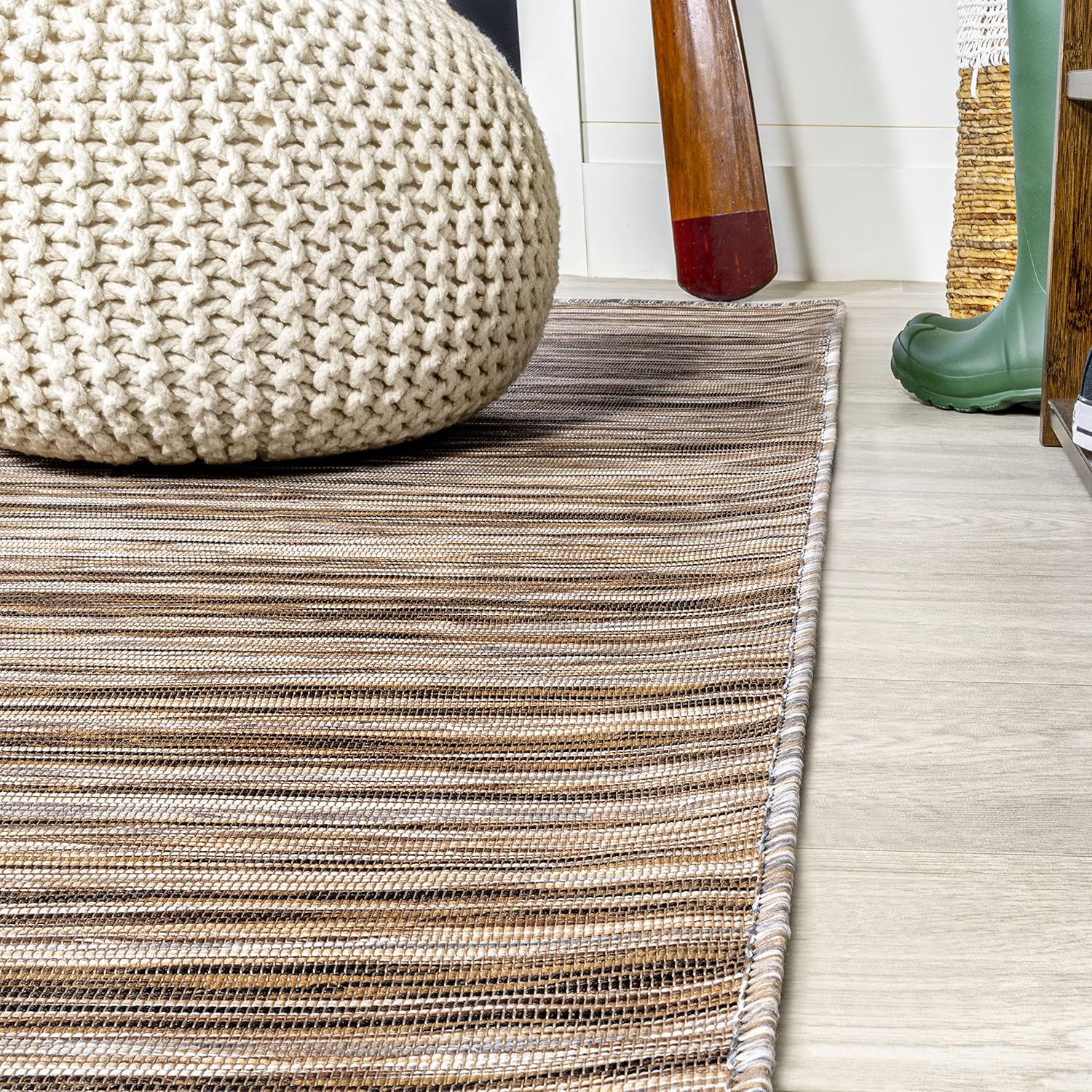Anchor your mid-century modern, urban contemporary, or farmhouse-inspired space with our flat-weave striped rug. The mingled jute-brown stripe design is practical for high-traffic areas with kids and pets. Add pattern to a living room, dining room, entry, office or bedroom with this easy-care synthetic rug.