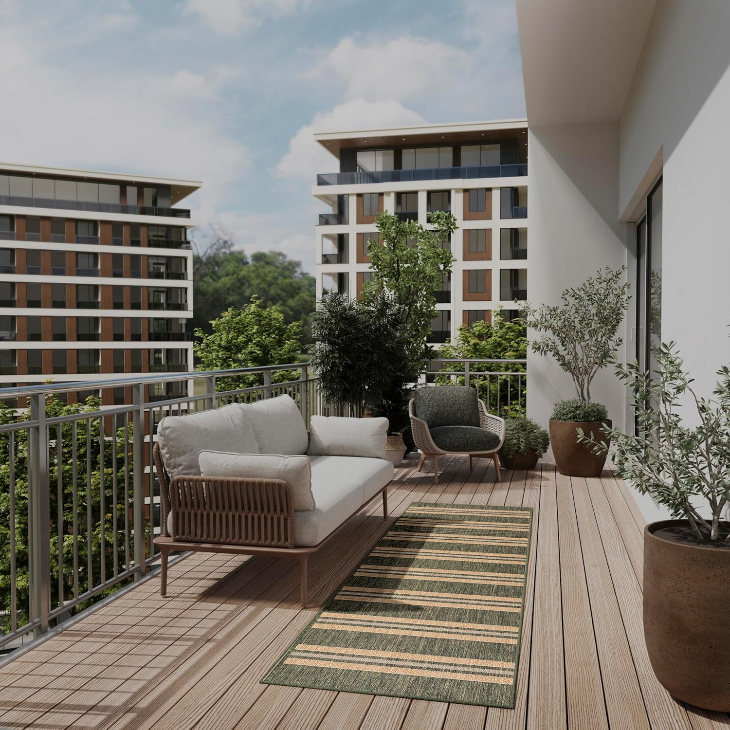 Equal parts versatile and timeless, the Horizon Collection of outdoor rugs enhances your space with captivating style. These flatwoven geometric rugs feature our signature high-low finish and subtle tonal variations that add movement and dimension. Each style is made from a blend of polypropylene and polyester that’s a breeze to keep clean, making Horizon ideal for both indoor and outdoor use. Bring a relaxed feel to your space with this green striped outdoor rug from the Horizon collection. A series of broad and narrow stripes creates an airy, coastal-inspired look that works beautifully in both indoor and outdoor settings. This flatwoven rug is made from a blend of polypropylene and polyester, making it a practical choice for busy households with pets and young children.